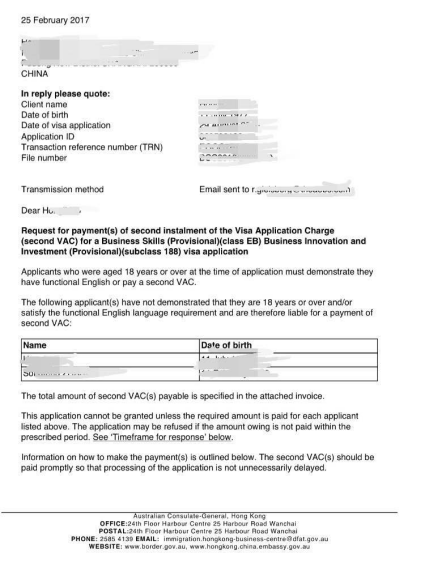2017年2月25日,恭喜我們的客戶X女士澳洲188A收到語言費通知。這意味著客戶離登錄澳洲就一步之遙啦。繳完語言費后預計2周左右就可以收到正簽信啦。最快的客戶當天繳完語言費就收到正簽信啦,速度之快,超乎想象。恭喜客戶,澳洲的藍天白云在向你招手啦。