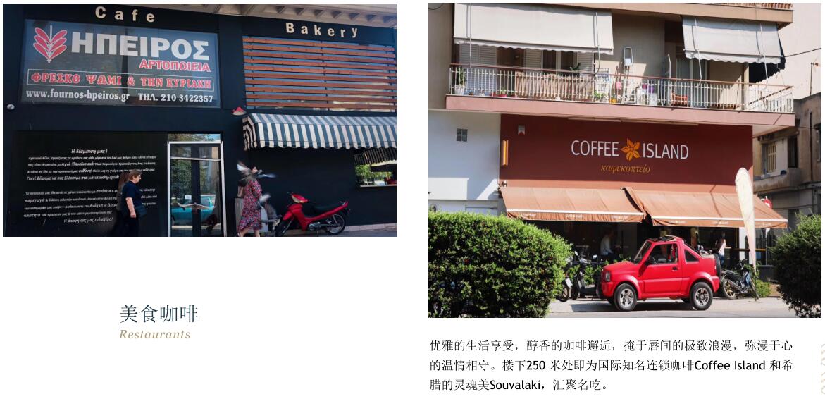 優雅的生活享受,醇香的咖啡邂逅,掩于唇間的極致浪漫,彌漫于心的溫情相守。樓下 250 米處即為國際知名連鎖咖啡 Coffee Island 和希臘的靈魂美食 Souvalaki,匯聚名吃。