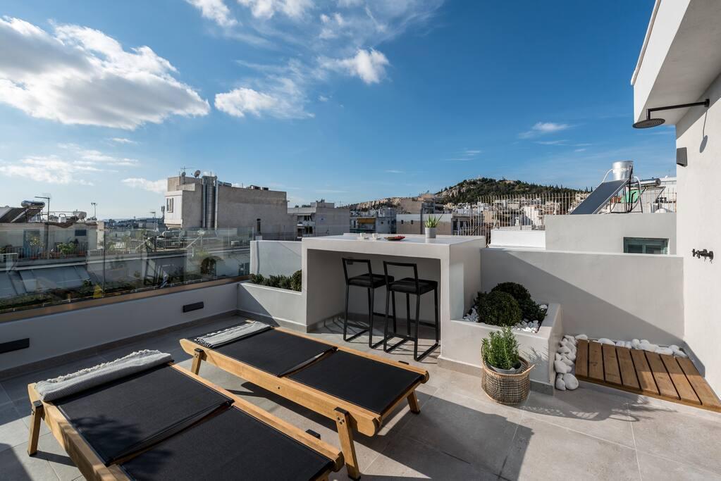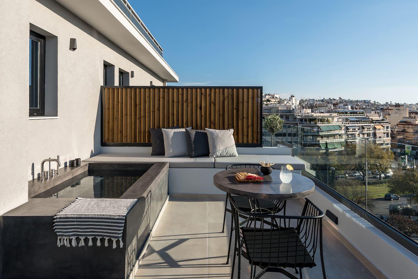 考慮到本項目為新建建筑,整體的立面風格希望更具有現代感。立面的陽臺統一采用淺色穿孔鋁板做為外擋板,與深色的墻面形成反差和對比。開暢連續的陽臺也與雅典當地的城市面貌向吻合,體現出新穎但不突兀的整體設計理念。