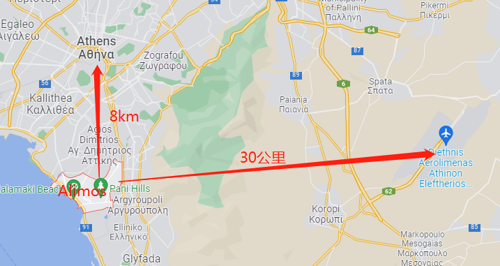 Alimos坐落在雅典西南部海岸線上,距離雅典市中心8公里,約15分鐘車程,距離雅典國際機場40分鐘的車程。