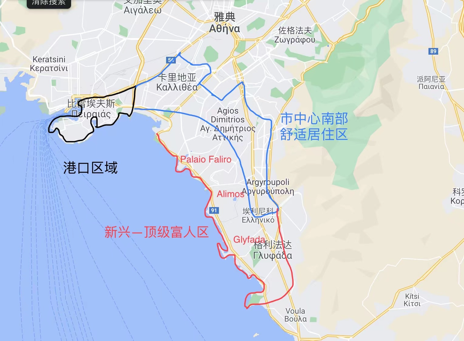 階層分布為船王,白領等高收入、高素質人群,是雅典海濱富人區。