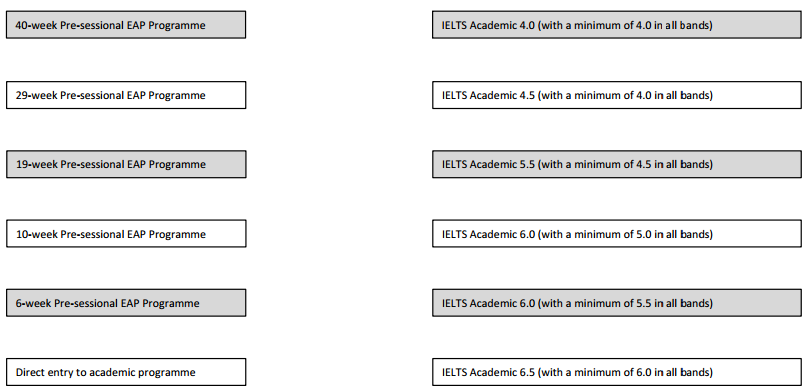 英國研究生申請又到了開始配語言課程的時間,部分學校陸續已經開放語言課程的申請了,很多雅思沒有達到直錄要求的學生們經常會問Nancy配語言課的問題,以利物浦大學International Business MSC這個專業為例,此專業的直錄雅思要求是6.5,小分6.0 ,如果學生實際考的雅思是6.0(L5,R,W5.5,S6.0)分,那根據利物浦大學配語言課程的要求,請看下面圖片要求,這個學生的實際雅思成績需要配10周的語言課程。